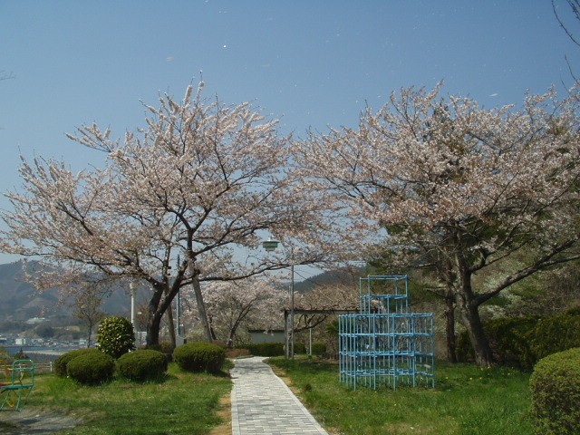ものすごい風がず〜っと、吹いています。桜が少し、寂しい。海も見えます。