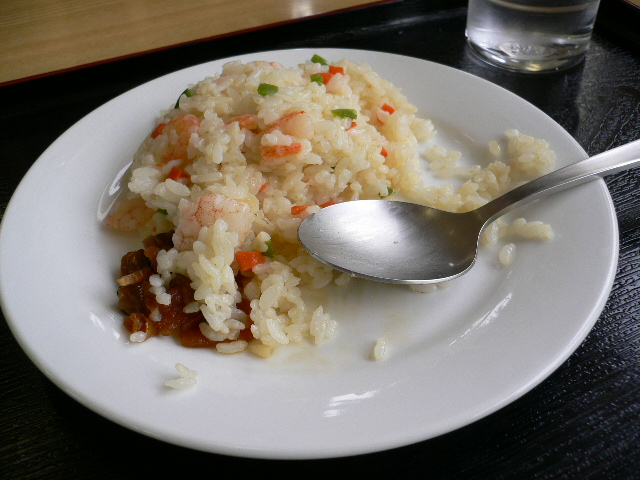 昼食は、エビピラフ。これが、思いっきり、冷凍食品をチンしたやつ。